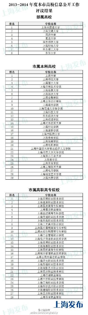日前,从市教委获悉,本市65家高校信息公开评议结果出炉,2013-2014年度沪上高校信息公开评议结果:市属高职高专院校,上海农林职业技术学院居首。