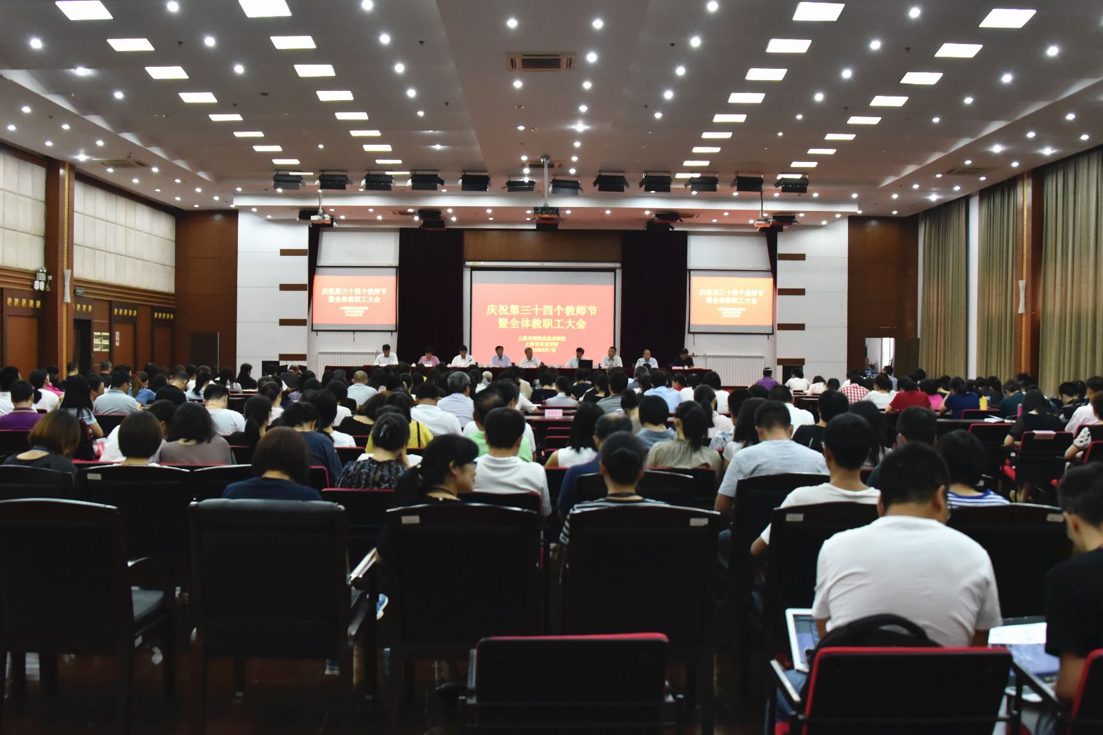 9月7日下午,第34个教师节来临之际,学校在学术报告厅召开教师节庆祝大会暨全校教职工大会。党政班子成员出席,党委书记吴乃山主持。