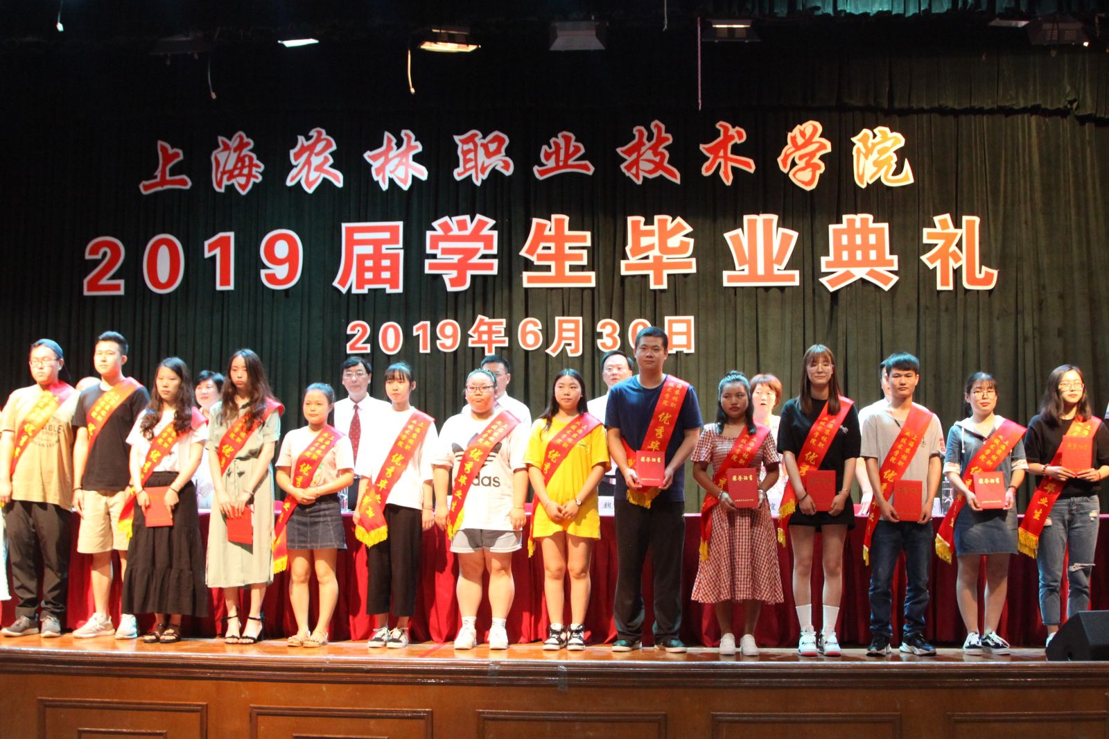 党委副书记俞锦禄宣读《关于授予侯溢等36名同学“上海农林职业技术学院2019年度优秀毕业生”荣誉称号的决定》和《关于秦雪珠等36名同学荣获“2019年度上海市优秀毕业生”荣誉称号的通知》,副院长谢锦平宣读《上海农林职业技术学院关于准予2019届毕业生毕业的决定》,党政领导现场颁发上海市高校优秀毕业生、学院优秀毕业生和学生毕业证书。