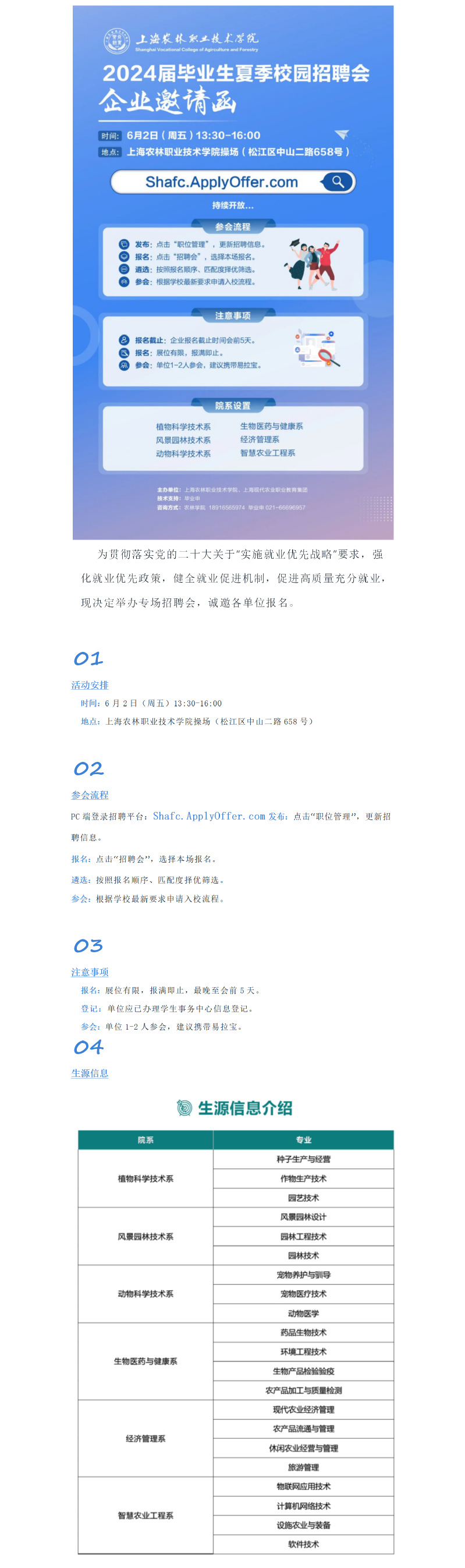 上海农林职业技术学院2024届毕业生夏季校园招聘会企业邀请函
