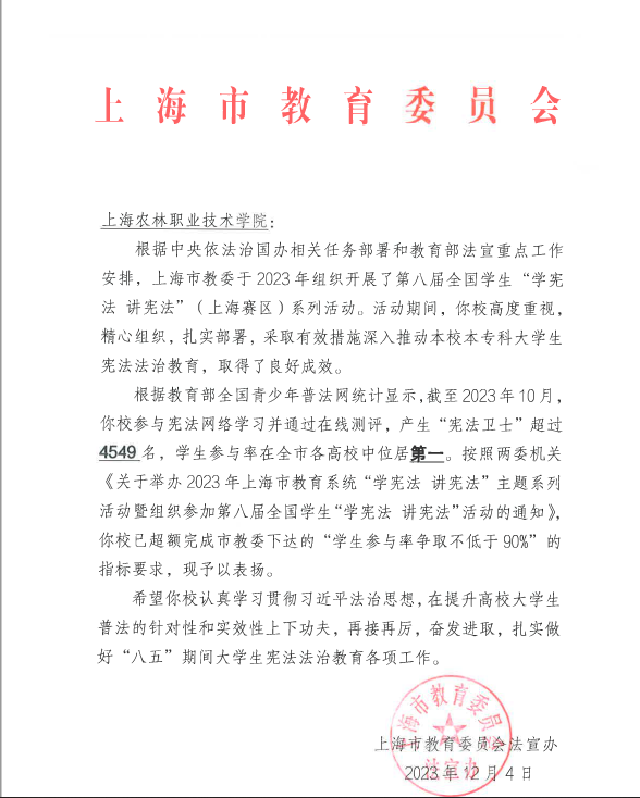 近日,从上海市教育委员会获悉,学校在第八届全国学生“学宪法 讲宪法”(上海赛区)系列活动中,以在全市各高校中位居第一的学生参与率荣获上海市教育委员会的通报表扬。