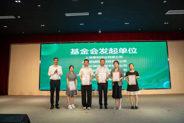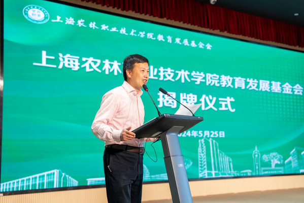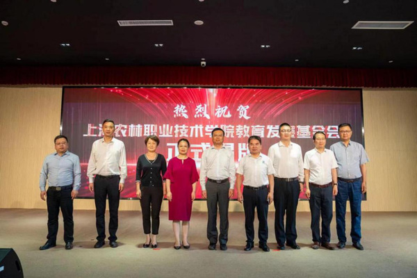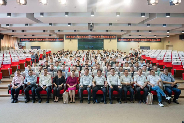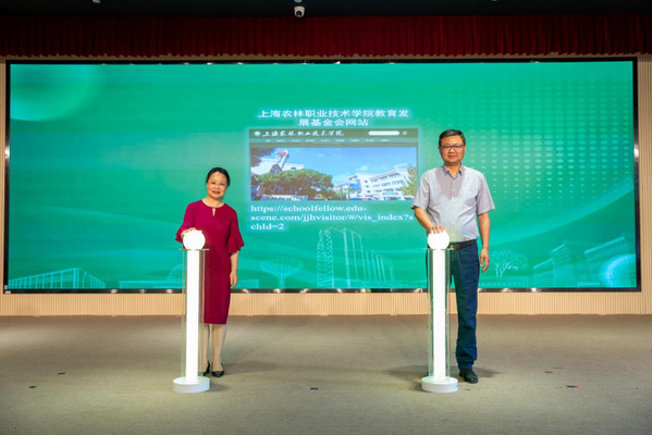 中国银行松江支行党委书记施利英,上海华维可控农业科技集团股份有限公司董事长吕名礼,校领导蔡红、陈谊、邵阳、费国强、潘国俭、张江,教育发展基金会理事长高功辉共同为学院教育发展基金会揭牌。